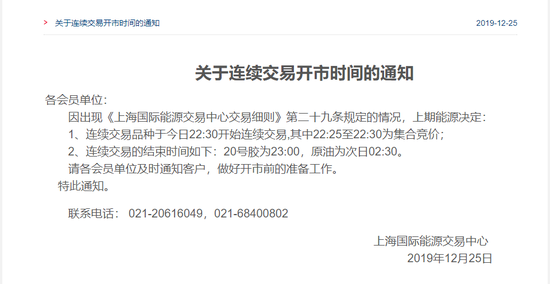 原标题:关于连续交易开市时间的通知发布日期:2019-12-25各会员单位:因出现《上海期货交易所连续交易细则》第七条规定的情况,我所决定:1、我所连续交易品种于今日22:30开始连续交易,其中22:25至22:30为集合竞…