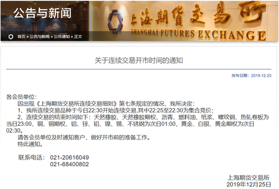 新浪财经讯 12月25日消息,上期所今日晚间发布《关于调整连续交易开市时间的通知》,称因交易所结算系统故障,导致30%以上参与连续交易的会员在开市前不能完成结算工作,根据《上海期货交易所连续交易细则》第七…