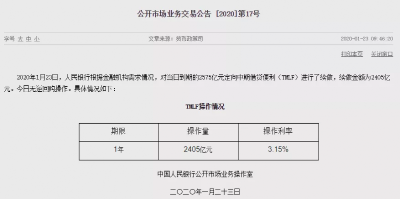 【央行开展定向中期借贷便利(TMLF)操作2405亿元】2020年1月23日,人民银行根据金融机构需求情况,对当日到期的2575亿元定向中期借贷便利(TMLF)进行了续做,续做金额为2405亿元。今日无逆回购操作。(央行网站)…