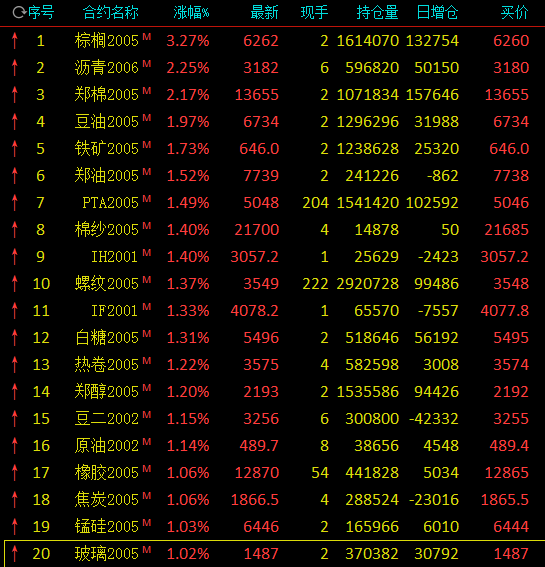 新浪财经讯 12月27日,国内期市早盘大面积上涨,棕榈油涨逾3%带领油脂类走升,豆油、菜籽油涨近2%,其他农产品中,棉花涨逾2%,棉纱、白糖、豆二涨逾1%;能化与黑色系多数上涨,沥青涨逾2%,铁矿石、PTA、热卷、…