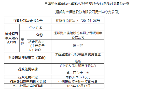 新浪保险讯 12月20日消息,抚州银保监分局近日发布行政处罚信息公开表显示,恒邦财产保险股份有限公司抚州中心支公司因未经监管部门批准擅自变更营业场所,被罚款3万元;责任人周宇琨被给予警告,并罚款2万元。行…