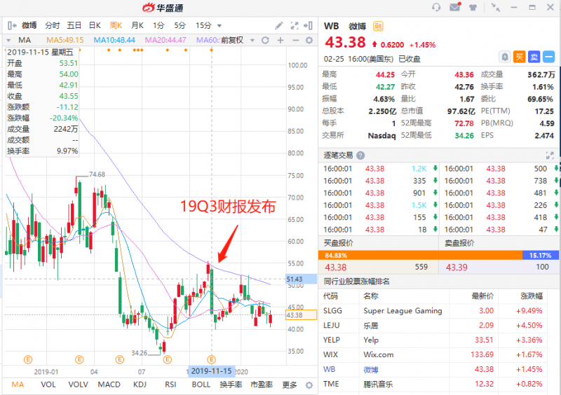 查看最新行情中国北京 / 2020年2月26日—中国领先的社交媒体微博公司(NASDAQ:WB)今日公布截至2019年12月31日的第四季度及全年未经审计的财务报告。“2019年我们在用户和商业化方面继续保持增长。”微博首席执…