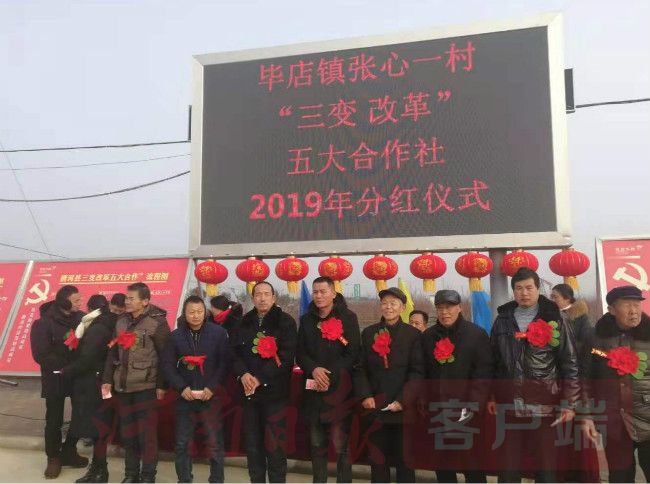 1月18日,在南阳市唐河县毕店镇张心一村的广场上,村民胸带红花,喜气洋洋。随着主持人一声令下,该村“三变”改革五大合作社2019年分红仪式正式开始。杜传景接过首次分红的1400多块钱,激动地说:“俺家十几亩地…