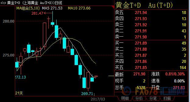 顺水鱼外汇网讯——3月14日夜盘,上海黄金T+D小幅高开0.27%,截止发稿,金价交投于271.79元/克,上涨0.26%。金价近期受到美国加息预期带来的压力而走跌,但又受到欧洲各国大选结果不确定性的影响而跌幅有限。周二…
