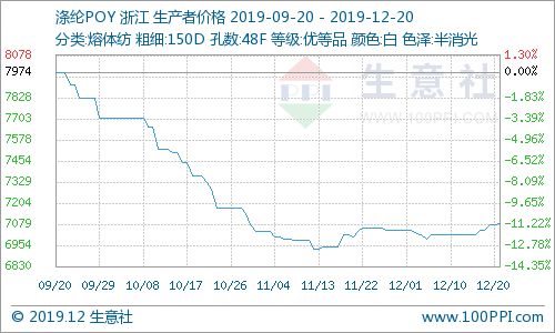 原标题:生意社:需求端将走弱 涤纶长丝价格存下跌风险生意社12月20日讯 根据生意社价格监测显示,本周国内涤纶长丝市场行情继续呈现小幅上涨态势,当前江浙一带主流工厂涤纶POY(150D/48F)在6900-7200元/吨,涤…
