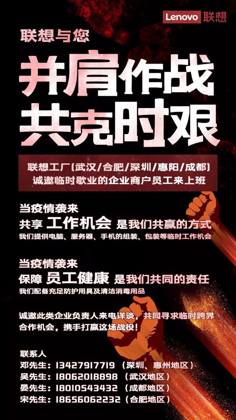 图片来源:联想集团微信公众号2月8日,联想集团官方微信公众号发布消息称,公司在武汉、合肥、深圳、惠阳和成都的工厂将为临时歇业的企业商户员工提供短期工作机会。具体工作包括电脑、服务器、手机的组装、包装…