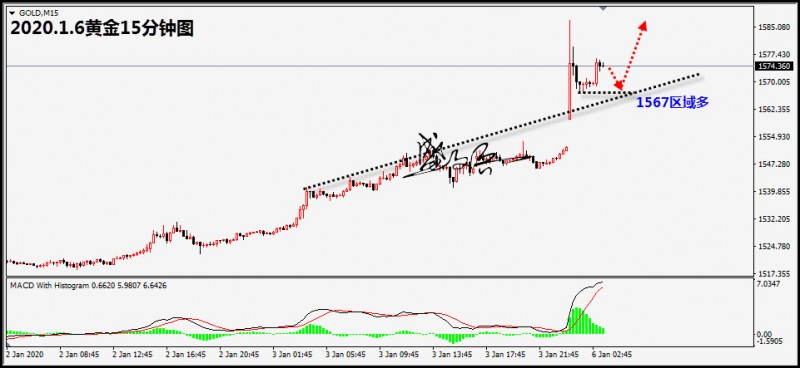 黄金周一(1月6日)直接跳空高空高走,开盘于1561,最高上涨至1588.54美元/盎司,创近七年来的新高,现报价1575.1附近,涨幅1.53%;主因中东局势愈演愈烈,避险情绪继续放大,支撑黄金的强势走高。1月4日有火箭弹…