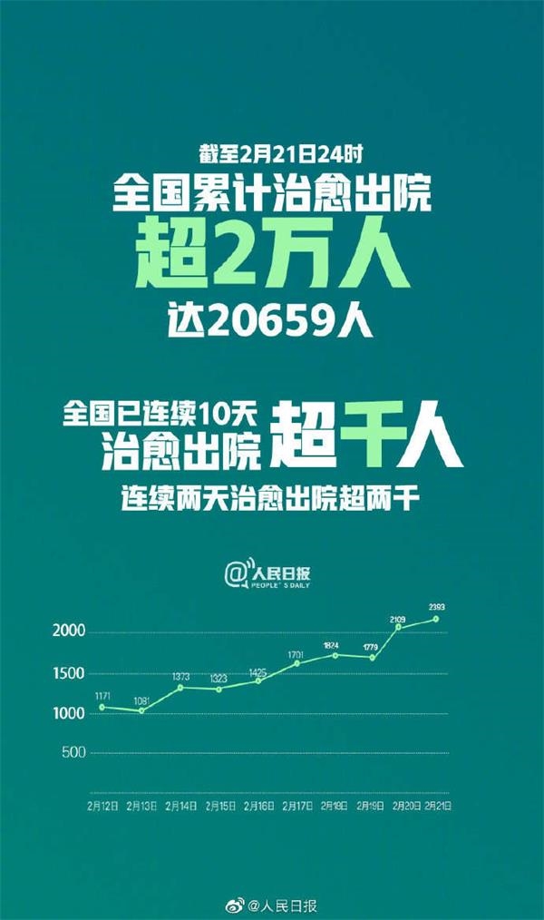 【全国连续10天治愈出院超千人 累计治愈出院超2万】据国家卫健委数据,全国连续10天治愈出院超千人,2月21日0—24时当日新增治愈出院病例2393例,截至2月21日全国累计治愈出院病例20659例。(人民日报)据国家卫…