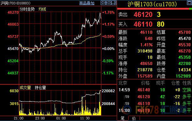 顺水鱼外汇网讯——1月10日,沪铜1703合约终盘收高0.83%到46110元/吨。日线上看,铜价已经有效上破下降趋势压力线阻力位,MACD指标零轴上浮附近勾头向上。但近期铜价走强很有可能是前期空头平仓回补所致。周一公…