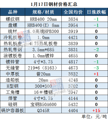 原标题:1月17日钢材价格汇总截至1月17日17:00,螺纹钢HRB400 20mm全国均价3834元/吨,跌1元/吨;线材8.0高线HPB300全国均价3919元/吨,无涨跌;冷轧板卷1.0mm全国均价4421元/吨,无涨跌;4.75热轧板卷全国均价38…