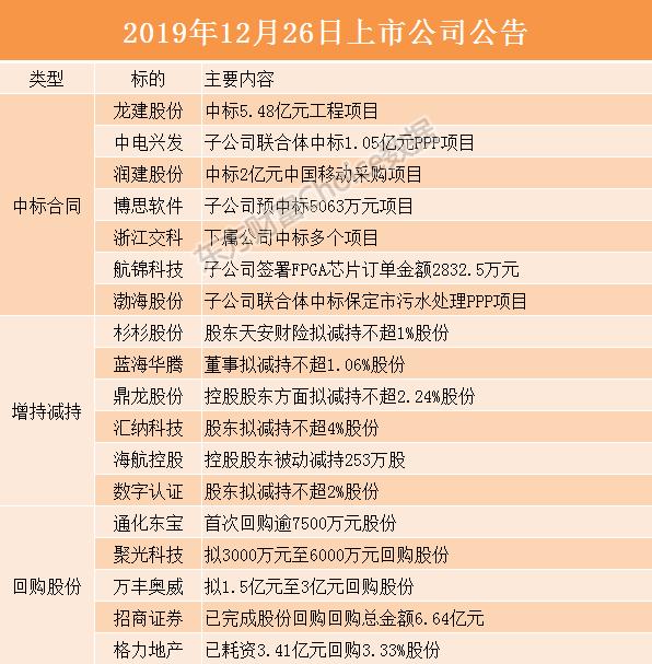 12月26日晚间,沪深两市多家上市公司发布公告,以下是重要公告汇总。 中标合同 渤海股份:子公司联合体中标保定市污水处理PPP项目 渤海股份(000605)12月26日晚公告,近日,公司的控股子公司嘉诚环保和全资子公司…