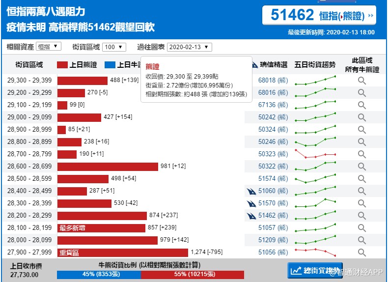截至2月14日,恒指最新的牛熊街货比例45:55。瑞信恒指牛熊证街货分布图中的数据显示,熊证街货重货区在27900-27999区间,该区间最新熊证数量为1274张,较上一交易日减少795张。最多新增在28100-28199区间,该区间…