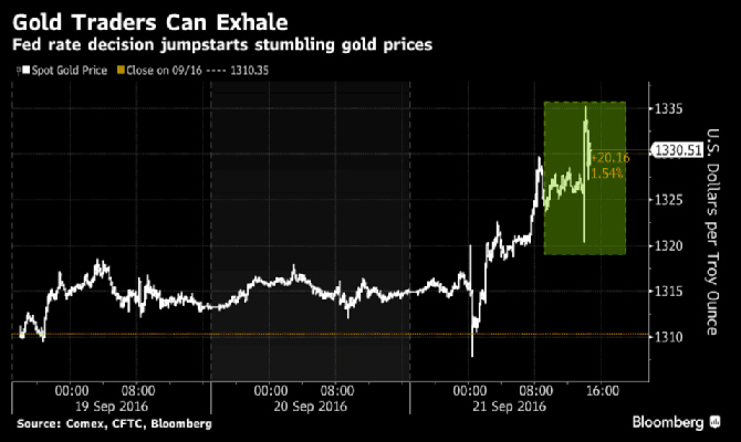 然而就在周四(9月22日)凌晨2点美联储宣布维持联邦隔夜基金利率上限0.5%及下限0.25%不变,第一黄金网数据显示,国际现货黄金价格短线出现强力拉升,美市盘中最高上探至1336.72美元/盎司,收于1336.45美元/盎司,上涨21.95美元,涨幅1.67%。