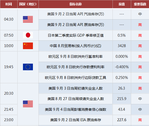 尽管8月美国ISM制造业和服务业数据远逊预期,旧金山联储主席Williams和里士满联储主席Lacker先后表态认为加息有理。前者说美国经济现状良好,逐渐加息合理且宜早不宜迟;后者说下半年美国经济会复苏,9月加息理由会是强有力的。投资者可关注今日晚间美国初请金数据。