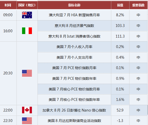 欧洲时段,经济数据稀少,且英国市场在时段内因夏季银行日休市,料市场波动幅度有限。市场走势更多还是以技术上给出的方向为准。投资者稍加留意下意大利的数据即可。