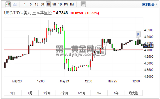 第一黄金网5月25日讯 23日,在土耳其央行的加息宣布加息后,土耳其里拉终于转涨,但在24日土耳其里拉再启跌势,美元/土耳其里拉重回4.7之上。