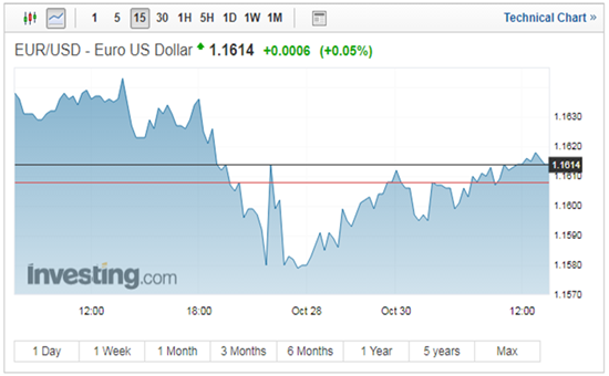 上周五(10月27日)欧元兑美元继前一日大幅下跌后继续下滑,当日最高点1.1643,一度跌至日内最低点1.1574,走出了自7月中旬以来的新低,心理关口1.1600已然不保。