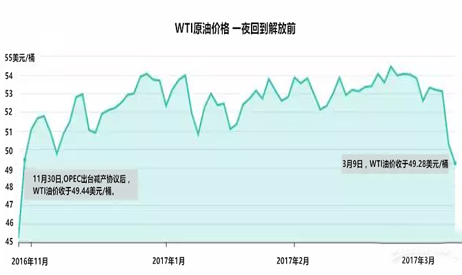 而今天公布的OPEC月报本身的数据已经不再如1月份那样具有解读意义了,因为至少从原油价格端来看,OPEC减产对全球原油实际供求平衡调节的预期已经被证伪了。油价近期跌回到了OPEC减产协议细则出台前的价格,这也是OPEC最不希望的结果,然而,就这么发生了,见下图。