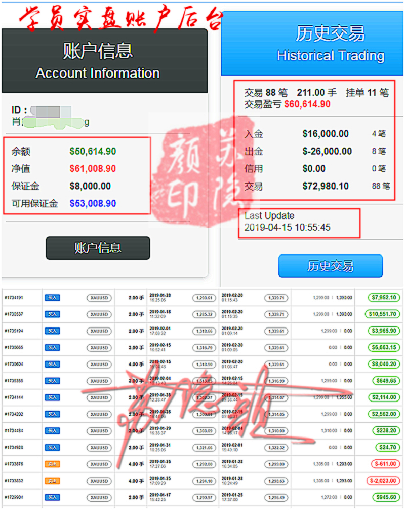 实仓学员1.6万美金到8.7美金三个月翻5.4倍!详细操作记录!这个市场,没有哪个人的单子能够保证100%正确,隐颜可以跟你认真的讲,隐颜也不可能百分百单子全对,也会有错单的时候,但是为什么一直说找隐颜指导操作而不是自己操作?因为自己操作的胜率可能连40%都不到,而隐颜通过自己的多年经验,可以将胜率带到80%甚至是90%以上。这样整体来看你认为还赚不到钱吗?