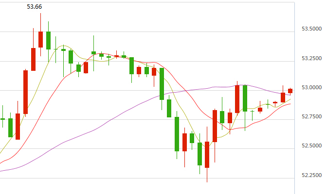 今日原油走势预测:从技术面来看小时图看日内高点53.5一线目前形成联排顶部压制位,成为今日的关键压制位,下方在52.1一线形成强支撑位,从四小时线上看油价上周五冲高回落于布林带中轨偏上方,下方受布林带中轨于52.2美元一线的支撑,MA5勾头向下/MA10均线雨脚死叉压制油价上行,附图MACD在0轴上亦是金叉,红色动能缩量不断减弱;原油当前依旧以低多为主.