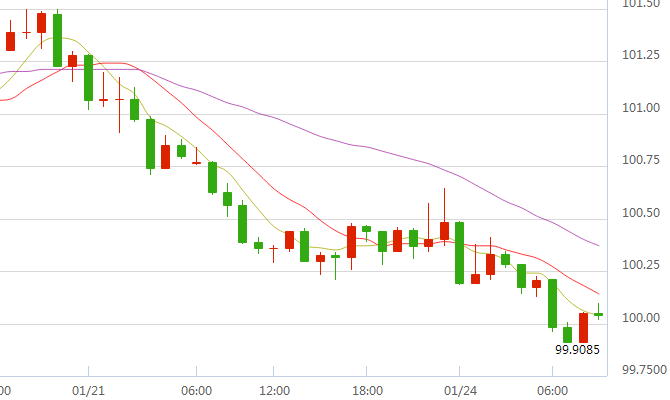 随后,美元指数开始走低,从当日日内高点最低大幅下跌超过0.7%,收盘较前一工作日下跌0.33%。1月23日亚洲时段延续上周跌势,最低跌至100.2055,刷新一个半月新低。