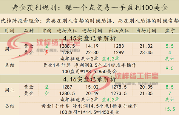 周一交易回顾:黄金自从1310受阻大幅回撤后,本周开盘依旧处于弱势状态,因此梓绮老师昨日日内依旧延续主空思路,布局了1288.5附近空单,欧盘开盘后黄金持续震荡下行不过力度并不大,直至美盘开盘黄金快速一波拉升后又迅速回落最终到达我们的止盈目标位。不过周一的行情略显清淡黄金回撤企稳后开始盘整,不创新低那我们就以震荡行情对待,因此梓绮老师给出1285附近多单,临近午夜时段多单在1289一线成功止盈。昨日共计操作2单,盈利2单,一个标准手净利润共计获利8.5个点,也就是一个标准手净利润共计获利850美金。