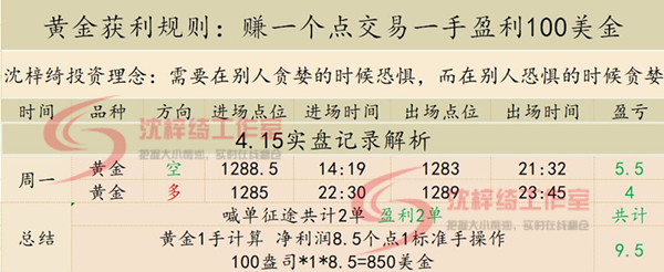 周一交易回顾:黄金自从1310受阻大幅回撤后,本周开盘依旧处于弱势状态,因此梓绮老师昨日日内依旧延续主空思路,布局了1288.5附近空单,欧盘开盘后黄金持续震荡下行不过力度并不大,直至美盘开盘黄金快速一波拉升后又迅速回落最终到达我们的止盈目标位。不过周一的行情略显清淡黄金回撤企稳后开始盘整,不创新低那我们就以震荡行情对待,因此梓绮老师给出1285附近多单,临近午夜时段多单在1289一线成功止盈。昨日共计操作2单,盈利2单,一个标准手净利润共计获利8.5个点,也就是一个标准手净利润共计获利850美金。