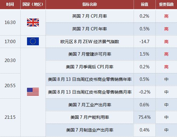 欧洲时段,欧元区方面关注ZEW经济景气指数和贸易帐数据。英国方面,一系列重磅数据将会公布。包括,CPI、PPI,零售销售和房价指数,虽然英国人在奥运会上春风得意,但他们进来的经济数据和后市经济前景却不被市场看好,如果这些数据疲弱,那么英镑有望进一步走低。