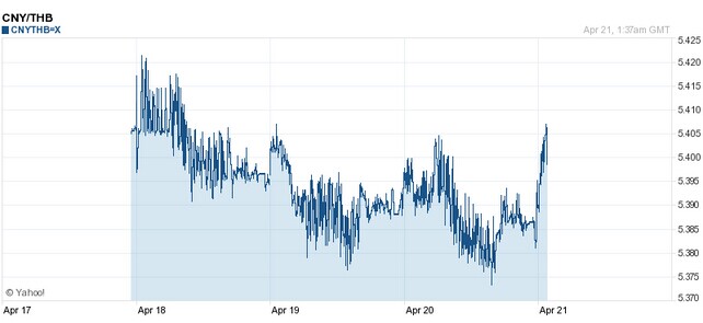 据银行间外汇市场最新消息,2016年04月21日人民币对泰铢汇率中间价为:1人民币对泰铢5.3908元,100人民币对泰铢539.08元。1泰铢对人民币0.1855元,100泰铢对人民币18.55元。