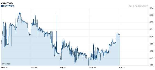 据银行间外汇市场最新消息,2016年04月01日人民币对新台币汇率中间价为:1人民币对新台币5.0045元,100人民币对新台币500.45元。1新台币对人民币0.1998元,100新台币对人民币19.98元。
