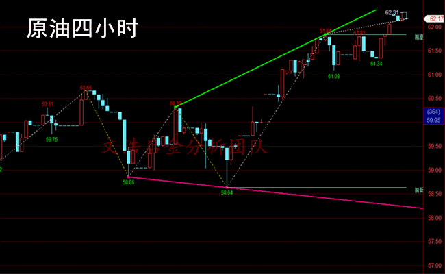 目前原油四小时级别沿上升趋势通道线在运行,上方63.6-8区域是趋势通道的顶部区域,目前价格离这里空间上已经不大,所以在四小时级别上,周一我们先继续维持看涨思路,等后续触及趋势线顶部后,再来空原油,这是结合美股的走势得到的分析,这轮跳水下方有望到达61-60.8区域,我们可以把握下,这是大方向,短期内,原油下方关注62.6-7区域,操作上文浩启金建议今日触及这里可多一次,上方关注63.6-8区域,周一不一定能涨到位,但下方做多的位置是确定的,具体我们看幅度,原油周一整体上短线上以回落做多为主,上方触及趋势通道线顶部后做空即可。综合来看,今日晚间操作思路上文浩启金个人建议以回调做多为主,反弹高空为辅,上方压力短期关注64.0-64.2一线阻力,下方关注62.6-62.8一线支撑。