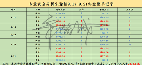 9.3-9.7转眼又到周末,一周的时间在这个市场上面你得到多少,又失去了什么?瀚城这边一周的交易完美结束,对于“金九银十”中九月的第一周,这一周的黄金低点至1189一线,高点在1206附近,上下波幅在17美金,艺漳本周实单12单,多位客户获得满意利润。本周净利润39个点,约27万人民币。