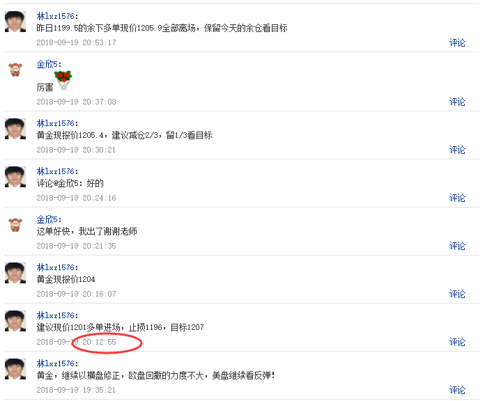 林先湛老师这里没有华丽的盈利截图,只是朋友圈实时喊单,文章给出都有延迟性,但是策略方向是没问题的,给出的点位是绝对有机会进场的,黄金方面晚间给出的黄金1201现价多单,已经完美获利,虽然没有到1208目标,但是所得利润已经够了,大趋势是正确的,到目标只是时间问题。晚间操作方面:黄金维持看涨不变,回落低点都是进多的机会,建议1200-1202附近进场,止损5美金,止盈1208。盘间行情时时变化具体操作策略以林先湛レ,亻言:lxz1576实战为准!