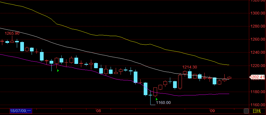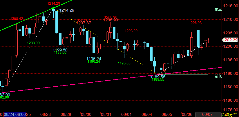 今天黄金价格早间盘面下方关注1195支撑,上方关注1204压制,破位1204顺势看1208前期高点