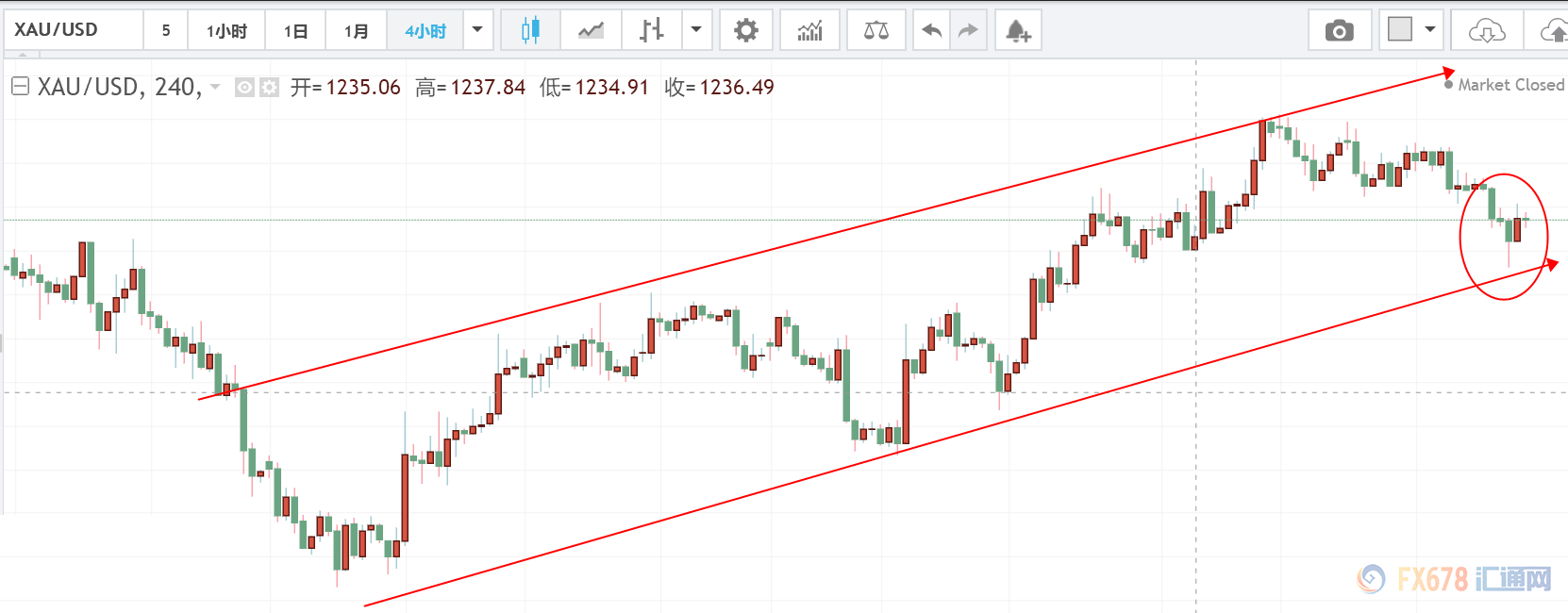 下方最直接的支撑是1237.09美元和1232.81美元,任何时候跌破了1232.81美元需警惕有进一步下行的可能。