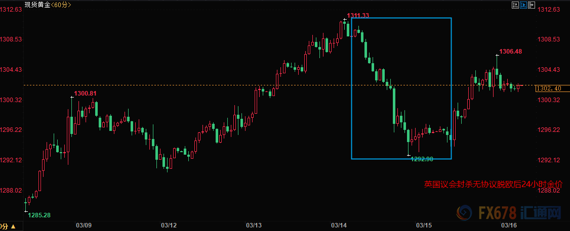 受此影响,黄金在美国CPI数据不佳推动走高的基础上进一步回升,并在周四英国议会就无协议脱欧投票前持续走高,并一度站上1310美元上方。