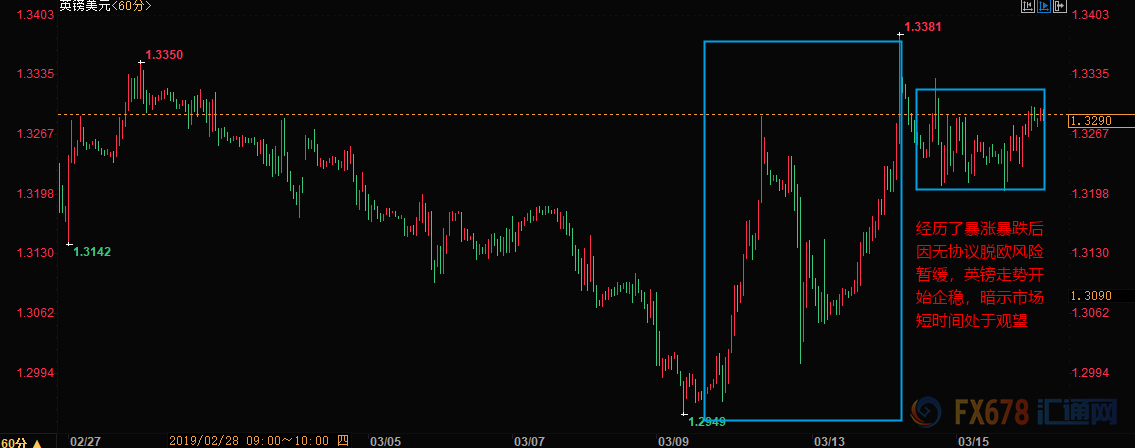 这从' 英镑的走势可以看出,此前因无协议脱欧风险尚存,英镑两次出现逾300点的波动,不过随着无协议脱欧遭议会封杀,英镑的走势已经明显持稳,暗示在有进一步的消息前,市场将维持观望的立场。