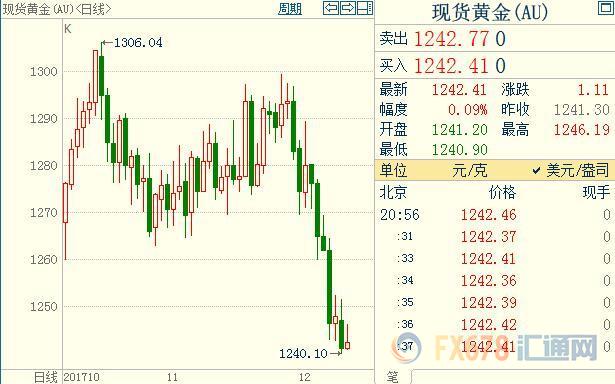 现货黄金已在支撑位每盎司1239美元企稳,可能将弹升至阻力位1250美元。