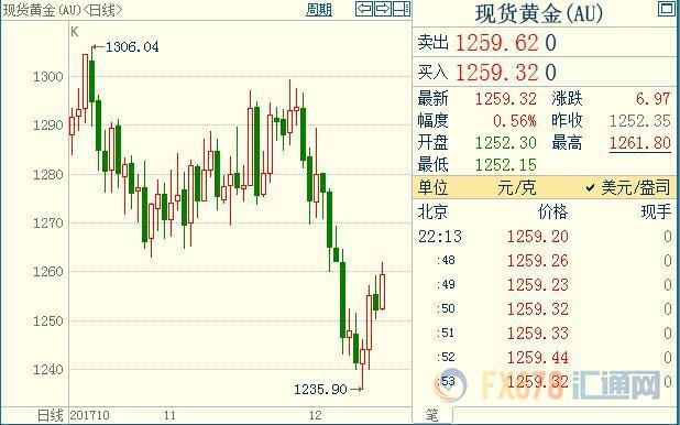 汇通财经易汇通软件显示,北京时间22:12,现货黄金报1259.54美元/盎司。 【免责声明】本文仅代表作者本人观点,与汇通网无关。汇通网对文中陈述、观点判断保持中立,不对所包含内容的准确性、可靠性或完整性提供任何明示或暗示的保证,且不构成任何投资建议,请读者仅作参考,并自行承担全部风险与责任。