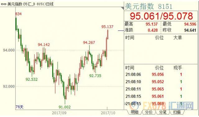 nload=imgresize(this); >截止发稿,欧元兑美元触及逾3个月低点1.1587,日跌0.53%;美指因此受到提振升破95大关,刷新7月20日以来高点至95.137;现货黄金承压下行,刷新10月6日以来低点至至1263.85美元/盎司,日跌0.25%。