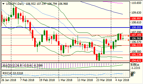 ②日线图上,汇价正测试3月13日高点107.30附近阻力,若稳定站上该点位,将形成W底形态,MACD金叉,中性偏多;
