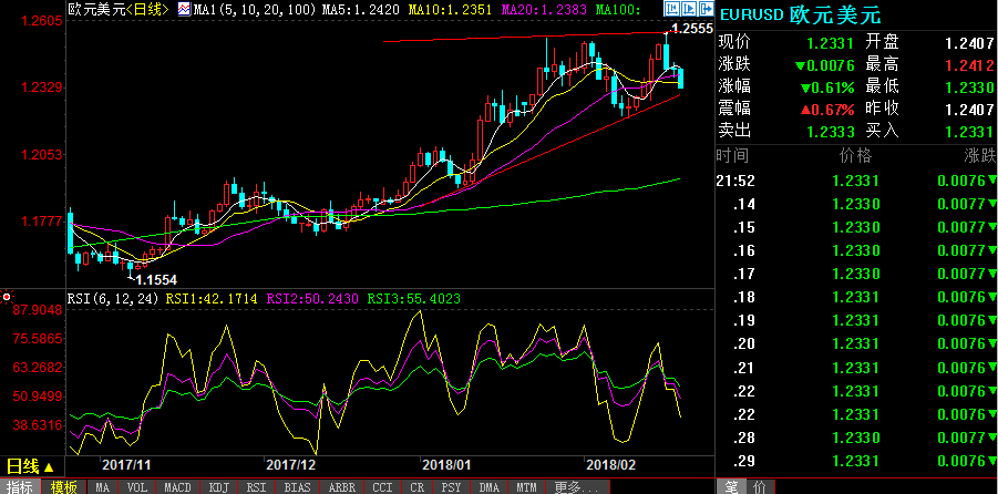 与预期一致,欧元兑美元跌破上周五(2月16日)低点1.2392,并考验了1.2360支撑位(隔夜最低触及1.2367水平)。