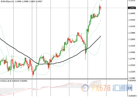 ②日线图上,汇价强劲攀升,不过目前汇价接近日线图布林带上轨,短线可能会有所调整
