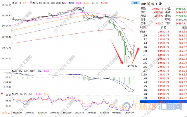 道琼工业指数大幅收高567.02点,或2.33%,至24912.77点;标准普尔500指数收涨46.20点,或1.74%,至2695.14点;' 纳斯达克指数收升148.36点,或2.13%,至7,115.88点。