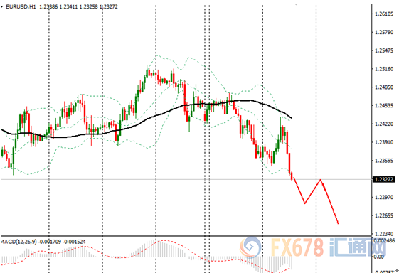 在欧元兑美元小时图中,我们发现目前价格处在明显的空头区域,接下来价格仍然有望进一步走低。