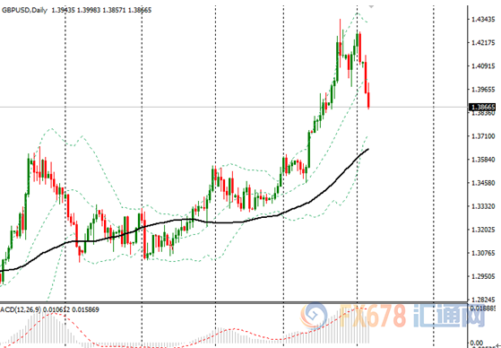英镑美元日线图中,我们可以发现目前汇价虽然维持在均线上方,但回落调整的压力很大,短期价格仍然有望回落至日线图60日均线附近。