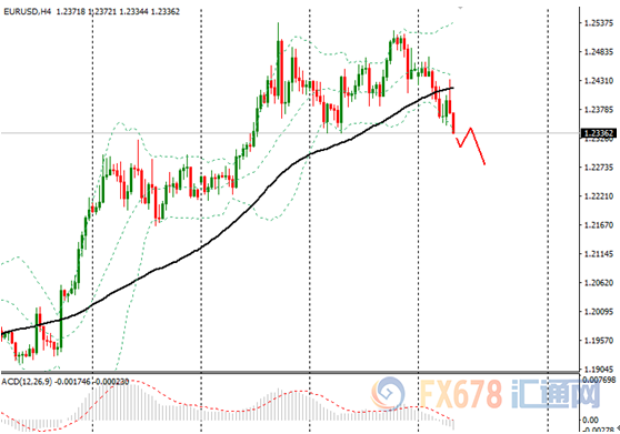 在欧元兑美元4小时图中,目前价格明显跌至均线下方,各项技术指标转向空方,汇价有望延续震荡下行。