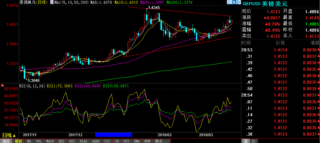 上行方面,目前已上破1.4140初步阻力位,后市可能再度向上测试1.1470和1.42整数关口。下行方面,关注会否跌破1.4075,跌破后可能加速跌向1.4025及1.40心理关口。