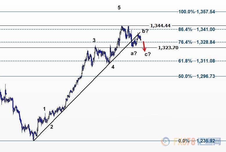 始于1323.70美元的涨势被视为是向上升趋势线的回调。只要金价维持在该线下方,1344.44美元附近的高点就依然有效。