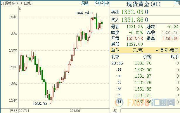 汇通财经易汇通软件显示,北京时间20:44,现货黄金报1332.49美元/盎司。 【免责声明】本文仅代表作者本人观点,与汇通网无关。汇通网对文中陈述、观点判断保持中立,不对所包含内容的准确性、可靠性或完整性提供任何明示或暗示的保证,且不构成任何投资建议,请读者仅作参考,并自行承担全部风险与责任。